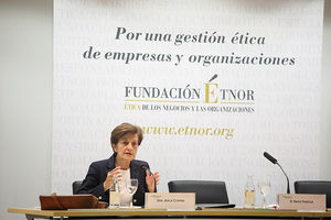 “El reto para ÉTNOR y para todos nosotros es que la sociedad civil tome carta en estos asuntos de “¿Por qué una Fundación de Ética Empresarial?” Cortina dio al menos tres buenas razones. En primer lugar, porque la actividad empresarial no puede estar más allá del bien y del mal, como ninguna otra actividad. “No se puede hacer empresa maximizando el beneficio caiga quien caiga”. La segunda razón, porque la ética es rentable para las empresas, “o al menos fecunda”. “Una empresa que se arma éticamente y tiene en cuenta a los grupos de interés tiene más posibilidades de mantenerse en el futuro, genera confianza, y ya hemos visto con esta crisis que cuando la confianza se quiebra todas las transacciones se hacen complicadísimas”. Y por último, porque “sin empresas éticas no hay una buena sociedad. Necesitamos el trabajo que generan, el capital social, que defiendan y protejan los Derechos Humanos, etc.” En primer lugar para abaratar costes. “Puede sonar vulgar pero es fundamental. Cuando todo el mundo recorta algo que pueda abaratar costes es vital. Si hiciéramos un mundo más barato entonces a lo mejor tendríamos que recortar menos. Creemos riqueza y gastemos en lo prioritario”. Ayuda a genera un buen carácter.