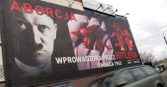 Concretamente en Alemania, la organización instaló vallas publicitarias en las que se mostraba la fotografía de un supuesto feto muerto ensangrentado al lado de una imagen de Adolf Hitler.